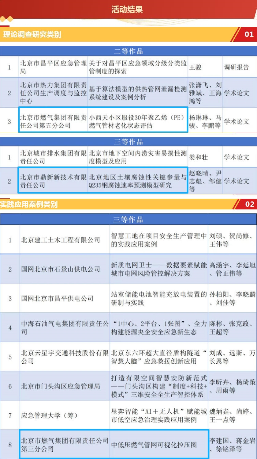 经过线上线下多轮专家评审,北京市燃气集团有限责任公司第五分公司(团队成员:杨琳琳、马骏、李鹏等)申报的《小西天小区服役30年聚乙烯(PE)燃气管材老化状态评估》荣获理论调查研究类二等作品,北京市鼎新新技术有限责任公司(团队成员:赵晓晴、尹志彪、邹健等)申报的《北京地区土壤腐蚀性关键参量与Q235钢腐蚀速率预测模型研究》荣获理论调查研究类三等作品,北京市燃气集团有限责任公司第三分公司(团队成员:李建国、蒋金岩、徐铭泽等)申报的《中低压燃气管网可视化控压图》荣获实践应用案例类三等作品。此次活动,集团在参赛企业系统中成绩突出,并在活动成果汇演中登台,全面展示集团在保障城市安全稳定运行中发挥的重要作用。